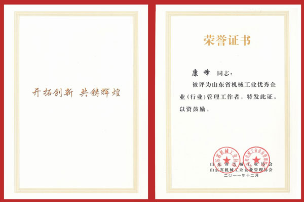 1月10日,山東省機械工業(yè)工作會議在泰安市東尊華美達酒店隆重召開,中國機械工業(yè)聯(lián)合會特別顧問朱森第、山東省機械工業(yè)協(xié)會會長劉衛(wèi)東、泰安市副市長閆新建等領(lǐng)導出席會議并頒獎。公司董事長、總經(jīng)理康鳳明,常務副總經(jīng)理潘憲平、副總經(jīng)理康峰等領(lǐng)導參加會議。董事長、總經(jīng)理康鳳明榮獲“山東省機械工業(yè)優(yōu)秀企業(yè)家”稱號,副總經(jīng)理朱洪臣榮獲“山東省機械工業(yè)有突出貢獻科技專家”稱號,副總經(jīng)理康峰榮獲“山東省機械工業(yè)優(yōu)秀企業(yè)(行業(yè))管理工作者”稱號。