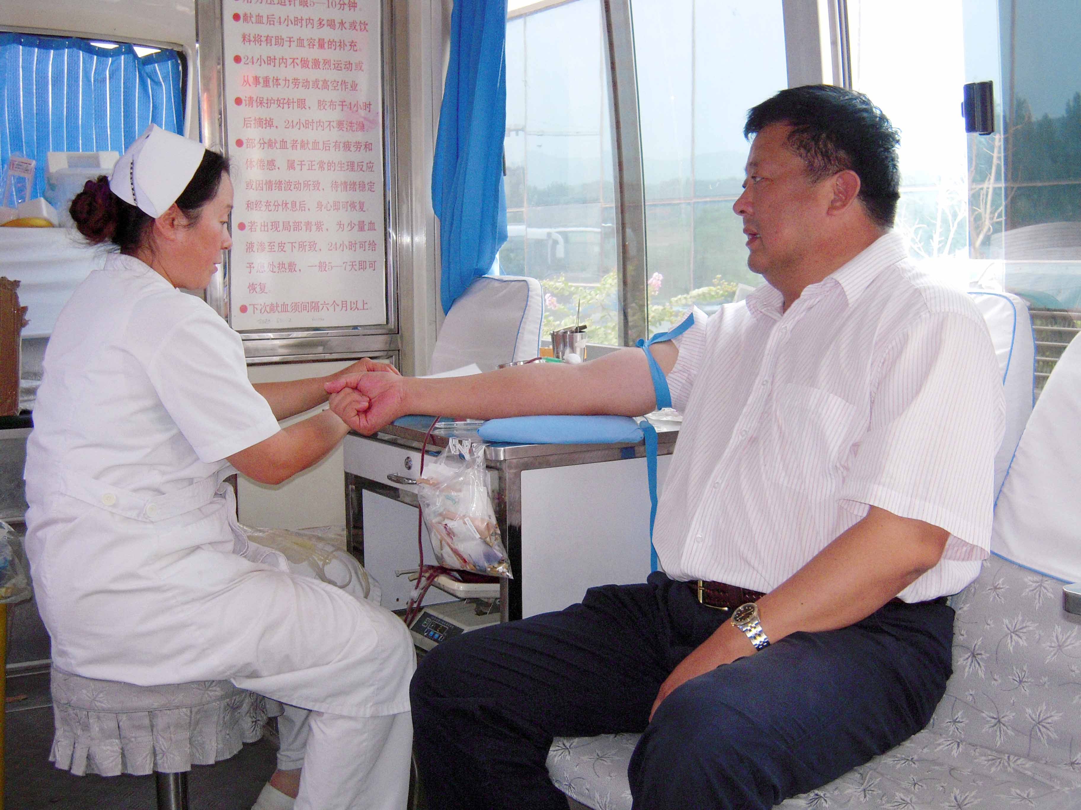 | ▲董事長、總經(jīng)理康鳳明帶頭獻血 | ▲副總經(jīng)理朱洪臣獻血 |