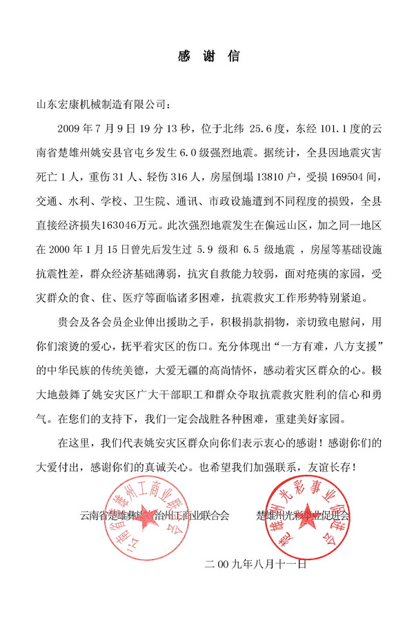 2009年7月9日,云南省楚雄彝族自治州姚安縣官屯鄉(xiāng)發(fā)生6.0級(jí)強(qiáng)烈地震,造成重大傷亡和財(cái)產(chǎn)損失。作為泰安市工商聯(lián)副主席會(huì)員單位,在危難關(guān)頭伸出援助之手,向?yàn)?zāi)區(qū)人民進(jìn)行了捐款援助。以下是轉(zhuǎn)載自該州工商聯(lián)發(fā)來(lái)的感謝信。