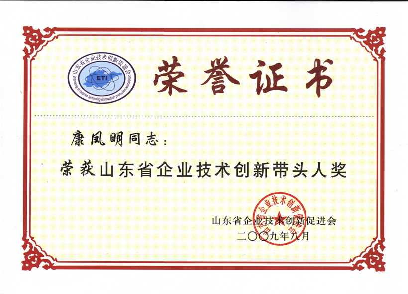根據山東省企業技術創新促進會下發的《關于公布“山東省企業技術創新獎”、“山東省企業技術創新帶頭人獎”評選結果的通知》(魯創促字【2009】8號)文件,我公司榮獲“山東省企業技術創新獎”,公司董事長、總經理、技術中心主任康鳳明、副總經理、技術中心常務副主任朱洪臣同時榮獲“山東省企業技術創新帶頭人獎”。