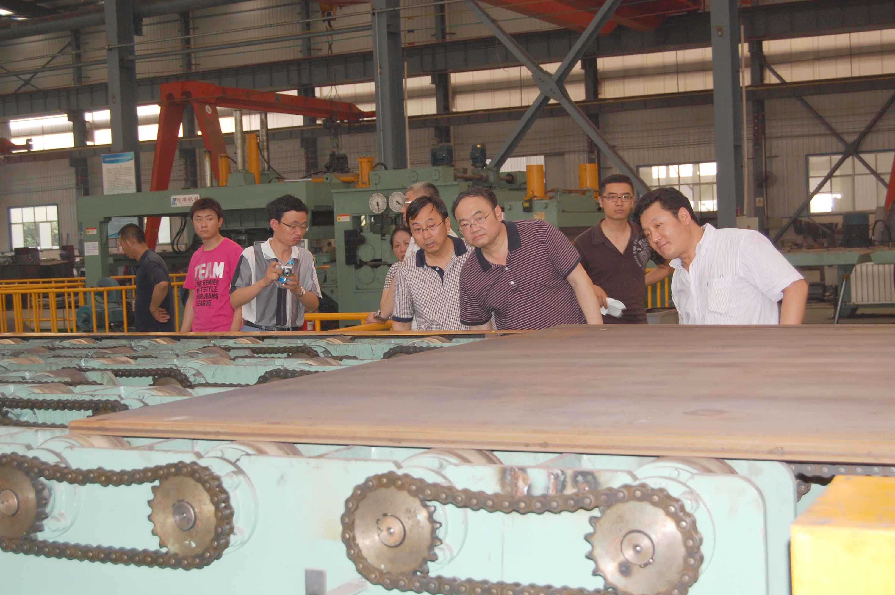 6月29日,首鋼京唐鋼鐵聯合公司領導組團來公司考察。圖為副總經理朱洪軍陪同該公司銷售部常務副部長劉憲君在鋼鐵物流公司考察T44-5~25.4×2200開卷矯平移動剪切生產線。