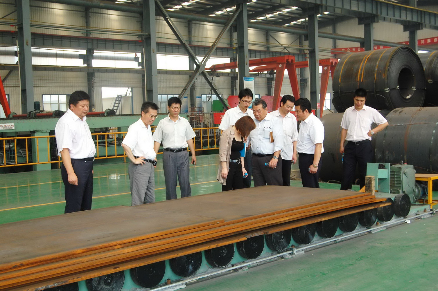 7月29日,日本SUMIKURA機械株式會社代表取締役、寧波住倉機械有限公司董事長兼總經理紀明岳(左二)及株式會社取締役川畑裕(右四)一行來公司考察合作項目。公司董事長、總經理康鳳明,常務副總經理潘憲平、副總經理朱洪軍等領導陪同考察。圖為客商在鋼鐵物流配送有限公司參觀考察移動剪切生產線加工情況。