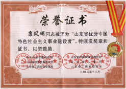 2005年12月21日,山東省優秀中國特色社會主義建設者表彰大會在濟南召開。副省長王仁元出席會議并講話,省政協副主席、省委統戰部部長齊乃貴主持會議,省政協副主席、省工商聯會長苗淑菊出席會議。公司董事長、總經理康鳳明喜獲“山東省優秀中國特色社會主義事業建設者”光榮稱號并被授予獎章。